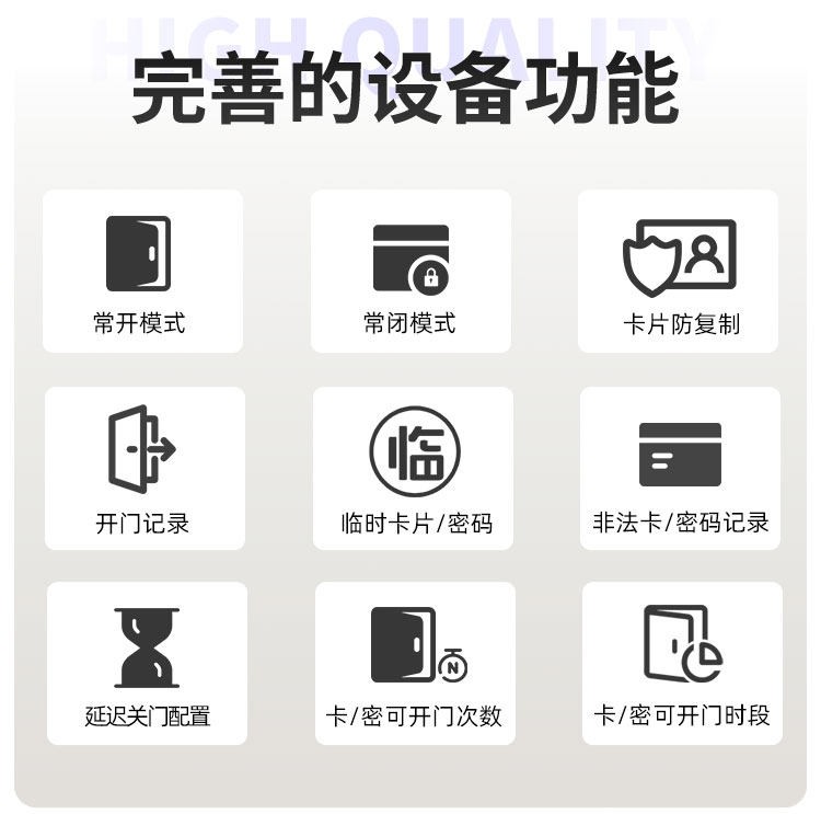 泉州这款智能门锁提供室内门锁和防盗门锁两种选择,其中室内门锁尺寸为 2806521mm,适配 5050 锁体;防盗门锁尺寸为 3657021mm,适配 6068 锁体,可满足不同场景的安装需求。它采用铝合金一体成型搭配钢化玻璃面板打造,兼具坚固耐用的品质与简洁美观的视觉效果。门锁支持蓝牙无线通讯,解锁方式丰富多样,密码、卡片、蓝牙、钥匙四种方式随心选择,满足不同使用习惯与应急需求。其工作温度范围为 - 20~70℃,能适应多数地区的气候条件,采用碱性电池供电,安装更换便捷,是兼具安全性与实用性的门锁选择。
